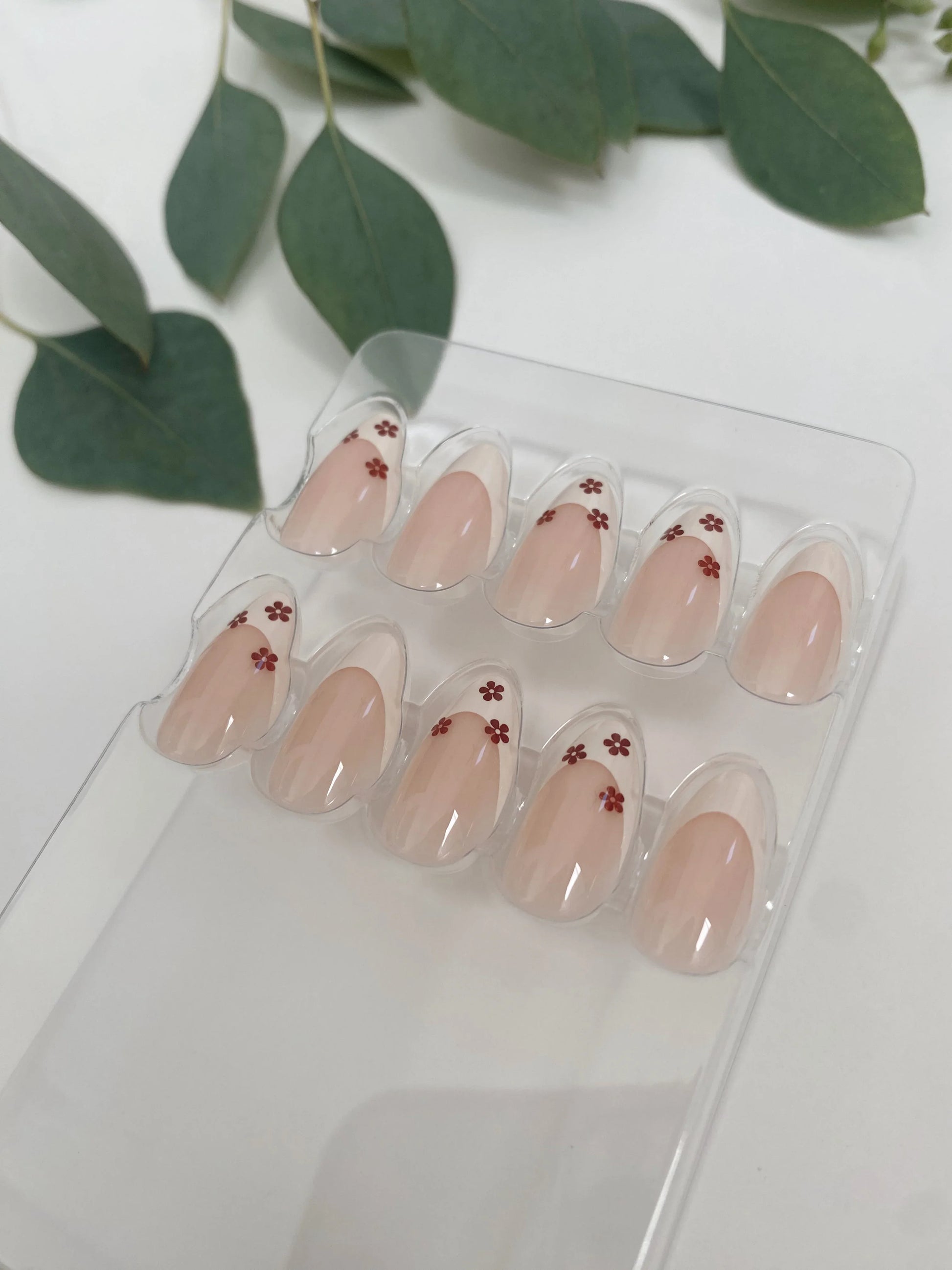 Adorn your nails with Hayride press-ons from Nightie Nails. These French tip nails feature a delicate brown floral design, perfect for a touch of autumnal charm.